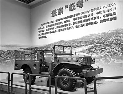 在紀(jì)念館第一部分進(jìn)京“趕考”第二單元展廳內(nèi),一輛軍用吉普車靜靜地陳列于此,這是毛澤東從西柏坡進(jìn)京時(shí)乘坐的同款吉普車。該車與普通吉普車相比車身較長,空間寬敞,駕駛員一側(cè)放置有備胎,沒有車門,唯獨(dú)副駕駛位置有個(gè)豁口;發(fā)動(dòng)機(jī)蓋為側(cè)開,形制十分特別。