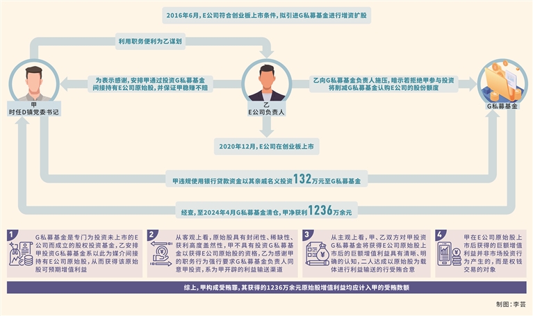 其中,2016年6月,E公司符合創(chuàng)業(yè)板上市條件,擬引進(jìn)G私募基金和H私募基金進(jìn)行增資擴(kuò)股。乙為感謝甲在企業(yè)用地審批等方面提供的幫助,提議安排甲通過(guò)投資G私募基金(該基金是專門為投資未上市的E公司而成立的股權(quán)投資基金,按照每股5.5元的價(jià)格取得E公司股本600萬(wàn)股,并辦理相應(yīng)的變更登記手續(xù))間接持有E公司原始股,并告知甲E公司擬上市情況以及其會(huì)與G私募基金簽訂對(duì)賭協(xié)議(若E公司未實(shí)現(xiàn)上市,G私募基金有權(quán)要求乙原價(jià)回購(gòu),并按照年利率10%支付補(bǔ)償款),甲無(wú)需承擔(dān)市場(chǎng)風(fēng)險(xiǎn),穩(wěn)賺不賠,甲表示同意。此后,乙向G私募基金負(fù)責(zé)人施壓,暗示若拒絕甲參與投資將削減G私募基金認(rèn)購(gòu)E公司的股份額度,并將該額度交由其競(jìng)爭(zhēng)對(duì)手H私募基金認(rèn)購(gòu)。隨后,甲違規(guī)使用銀行貸款資金以其親戚名義投資132萬(wàn)元至G私募基金(根據(jù)相關(guān)規(guī)定,私募基金投資者應(yīng)當(dāng)具備相應(yīng)資金實(shí)力,不得用貸款資金從事股本權(quán)益性投資,甲的行為不符合規(guī)定)。2019年6月,I私募基金以每股11.52元溢價(jià)收購(gòu)G私募基金持有的部分E公司股份。2020年12月,E公司在創(chuàng)業(yè)板上市。經(jīng)查,至2024年4月G私募基金清倉(cāng),甲凈獲利1236萬(wàn)余元。