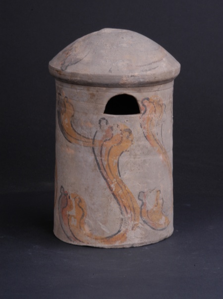 漢代,酒泉北稍門外出土。高19.4厘米,底徑11.6厘米。筒狀,球面頂,上部有一拱形倉門,筒身飾紅、黃、黑彩繪云氣紋。展現(xiàn)了當(dāng)時糧食豐收后的貯藏場景與人們對豐饒的祈愿。