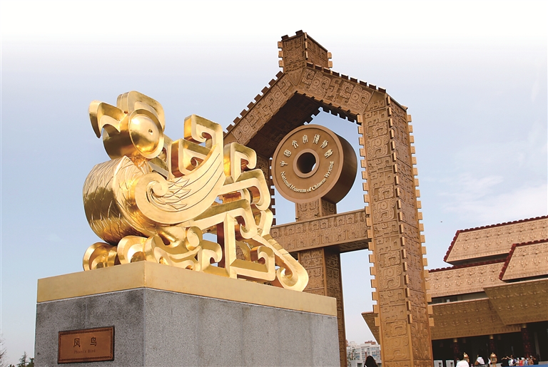 中國文字博物館前廣場。前方為鳳鳥雕塑,取形于青銅器鳳鳥紋。后方為字坊,取金文中“字”之形。中國文字博物館供圖