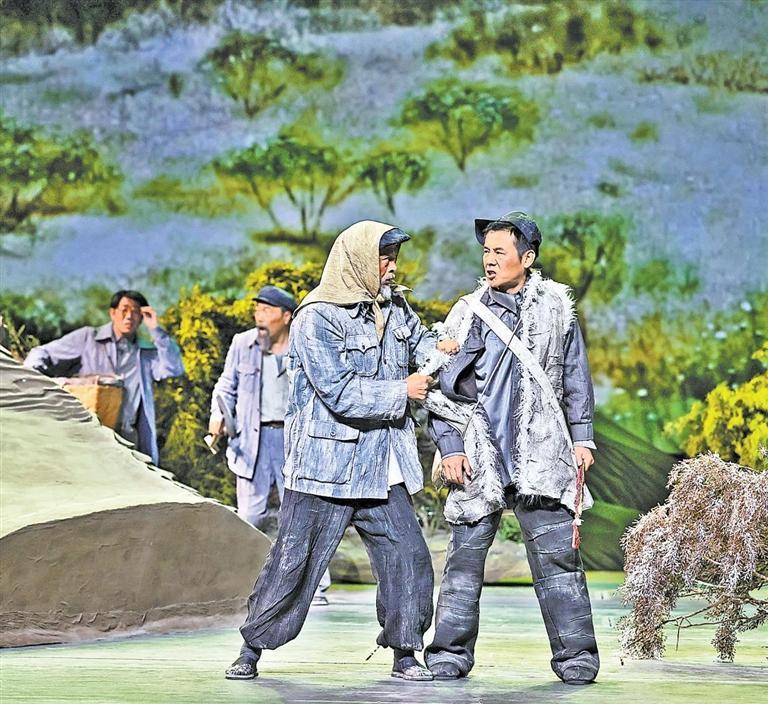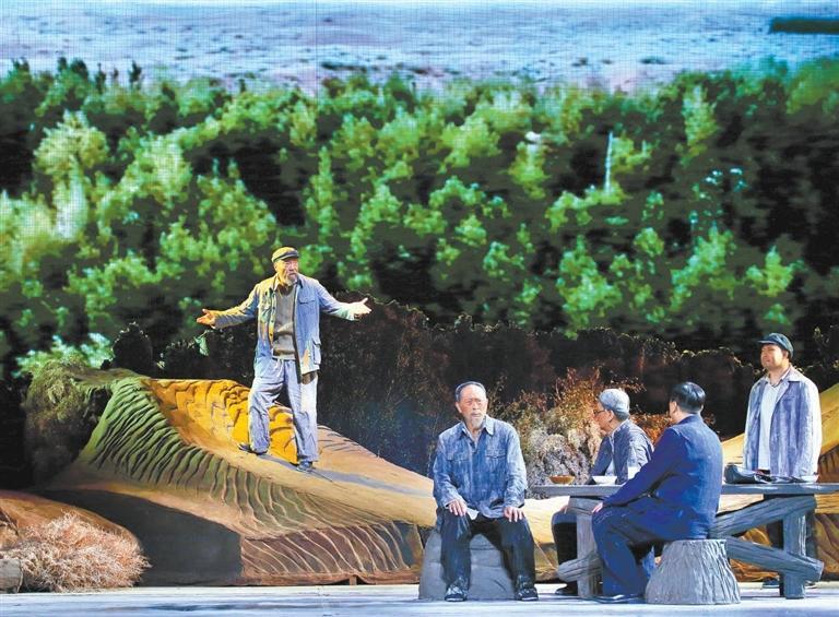現(xiàn)實(shí)題材是話劇藝術(shù)的寵兒,在話劇進(jìn)入中國(guó)一百多年的時(shí)光中,現(xiàn)實(shí)題材創(chuàng)作占據(jù)相當(dāng)大的比例。在近當(dāng)代中國(guó)歷史的進(jìn)程中,話劇始終起著敢為天下先、針砭時(shí)弊的作用,但話劇又有其極其特殊的藝術(shù)框范。人們?cè)谟^看話劇時(shí),仿佛就是在觀看自己的人生,觀看自己和身邊最熟悉的人們,這是話劇藝術(shù)獨(dú)具的極高的審美要求。尤其是現(xiàn)代題材的創(chuàng)作,稍有不慎便會(huì)陷入同質(zhì)化的僵硬模式,使舞臺(tái)藝術(shù)失去應(yīng)有的美感。話劇《八步沙》讓6個(gè)老漢成為舞臺(tái)聚光燈下的主角,體現(xiàn)了創(chuàng)作者們呼應(yīng)時(shí)代之需,為最普通的農(nóng)民寫生立傳的拳拳之心。6個(gè)老農(nóng)民談不上人們通常意識(shí)中的“美”,“治沙”這樣的故事也相對(duì)比較單調(diào),不大容易出彩,而創(chuàng)作者們以八步沙這個(gè)真實(shí)的地名作為劇名,以“六老漢”治沙這個(gè)真實(shí)的事件作為全劇的敘述內(nèi)容,卻能宕開一筆把特定的外部環(huán)境與人物的內(nèi)心世界巧妙地融為一體,為全劇注入了濃郁飽滿的戲劇情境和情感,使這部話劇有了獨(dú)屬于自己的一份力度、一份無法替代的光彩。全劇的情節(jié)一曲三折,以小見大,當(dāng)黑壓壓的沙塵暴鋪天而來的時(shí)候,當(dāng)六老漢在嚴(yán)酷的環(huán)境中吃盡苦頭,摸索出“一棵樹,一把草,壓住沙子防風(fēng)掏”的寶貴經(jīng)驗(yàn),使漫無邊際的沙漠終于出現(xiàn)一抹綠色,繼而眼看著一棵又一棵綠樹成活成林,終于成為一片綠洲的時(shí)候,我相信觀眾的心也被藝術(shù)琴弦撥動(dòng),始終被劇情牽著走,為劇中人物的命運(yùn)擔(dān)心、懸心、痛心、開心,從中深深地感受到劇中所蘊(yùn)藏的豐富內(nèi)涵和它所傳達(dá)出的真切意趣。