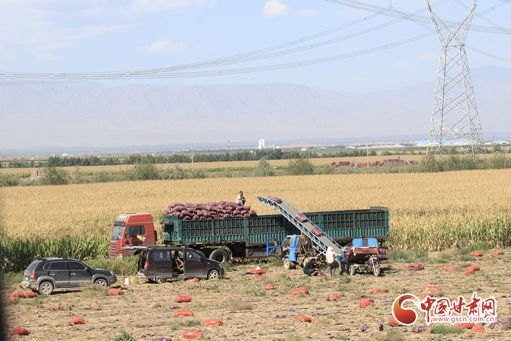 腳下有稻田,耳邊有水聲。帶著泥土的洋蔥整跺碼放,依次裝進(jìn)卡車?yán)?,鮮綠的高原夏菜在田間地頭收割后送進(jìn)發(fā)往南方的冷柜,百畝靑儲玉米經(jīng)過壓縮打包等待進(jìn)入牧場糧倉……祁連山下秋收正在火熱進(jìn)行中。