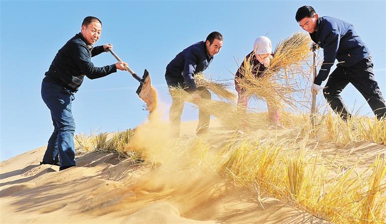 古浪縣八步沙林場(chǎng)工人在騰格里沙漠邊緣打草方格壓沙。甘肅省大力弘揚(yáng)“時(shí)代楷模”八步沙林場(chǎng)“六老漢”的奮斗精神,2012年至2021年,全省累計(jì)完成植樹(shù)造林4321.21萬(wàn)畝,沙化土地綜合治理2015萬(wàn)畝。張文燦攝(中經(jīng)視覺(jué))