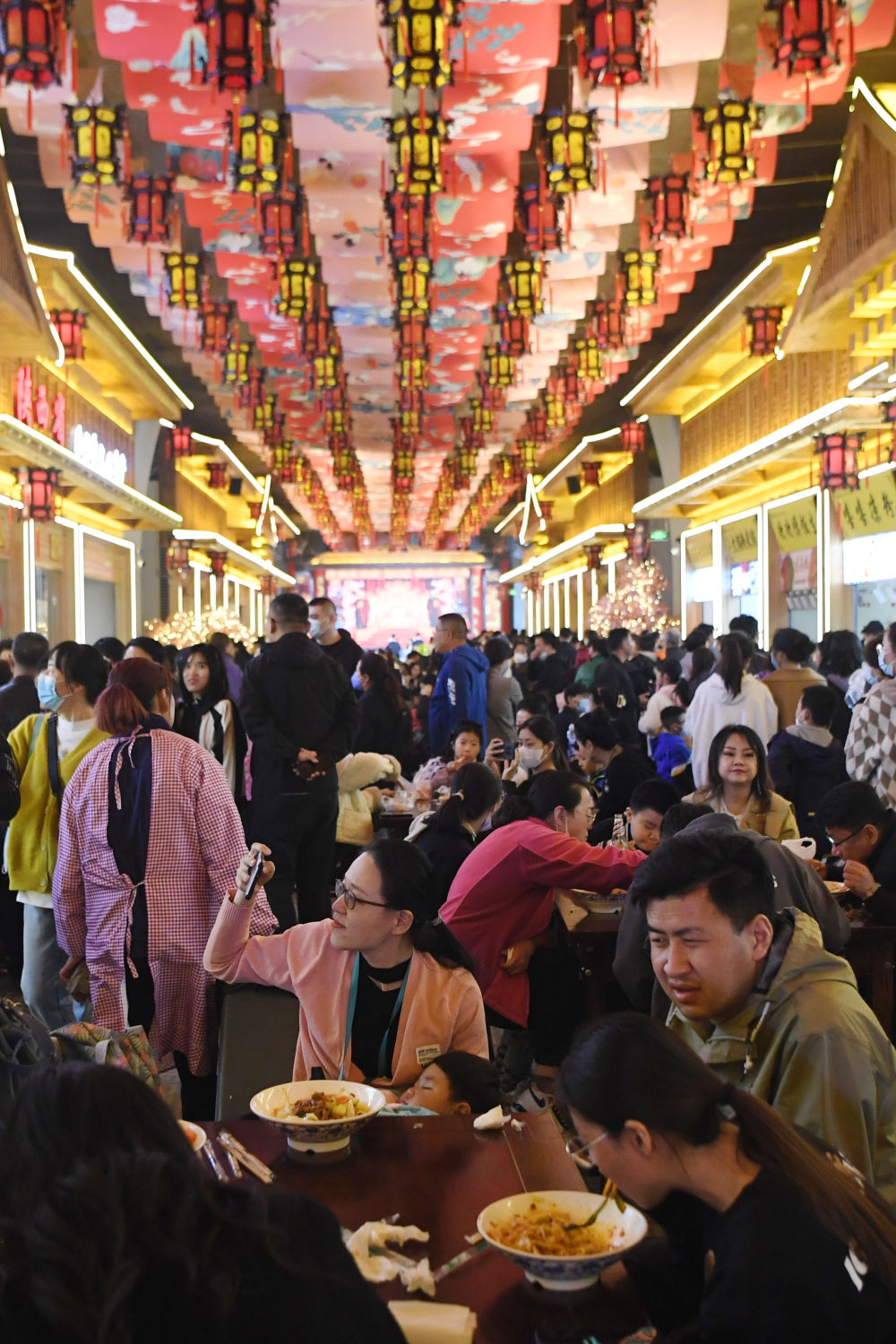 ↑3月25日,游客在“黃河食渡文化夜市”拍照留念。