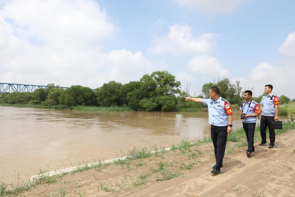 黃河派出所和黃河河務(wù)局水政監(jiān)察大隊(duì)人員對(duì)刁口河生態(tài)補(bǔ)水進(jìn)行巡查。新華社記者 劉詩(shī)平 攝