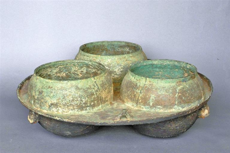 1979年,靈臺(tái)縣獨(dú)店鎮(zhèn)中慶村飲馬嘴漢墓出土了一件類似火鍋的連體三釜銅灶。通高16.4厘米,釜口徑分別為17厘米、17.4厘米、16.7厘米。三連釜,用九塊范鑄成。三釜均斂口,圓唇,球腹,圜底。圓盤窄沿,盤面近沿處分別置三個(gè)三角形掛鈕,盤下三釜外側(cè)各有一支釘,釜底有煙炱。從盤面間三系看,可供吊掛,盤陰三個(gè)支臺(tái),可用于支撐,顯然有流動(dòng)使用的功能。三個(gè)釜可同時(shí)烹煮不同食物,圓盤還可烘烤其他食品。老百姓俗稱三釜銅“火鍋”,但該銅灶是否為火鍋還需要進(jìn)一步考證。