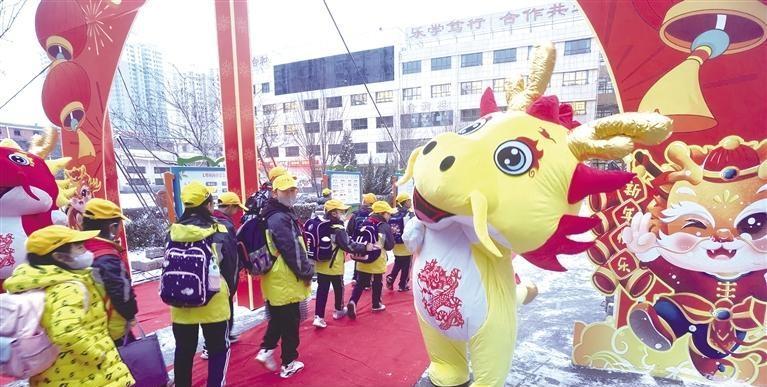 當(dāng)日上午7時(shí)許,記者在蘭州市東郊學(xué)??吹?,校門內(nèi)兩邊擺放著兩條由數(shù)百個(gè)氣球組成的長(zhǎng)龍。高年級(jí)段和低年級(jí)段的學(xué)生要穿越寫著“龍騰虎躍,前程似錦”的龍門,方可進(jìn)入教室。同時(shí),兩邊的老師,給每一位到校的學(xué)生發(fā)放小禮物。記者注意到,每個(gè)孩子都領(lǐng)到了一個(gè)小盲盒,里面裝著不同的文具。孩子們高興地?fù)]舞著手中的盲盒,展示新春的快樂。
