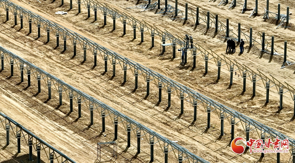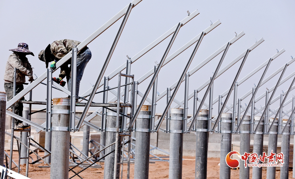 4月15日,甘肅省張掖市臨澤縣板橋鎮(zhèn)一養(yǎng)殖場工地上,工程建設(shè)者們正在安裝光伏板。