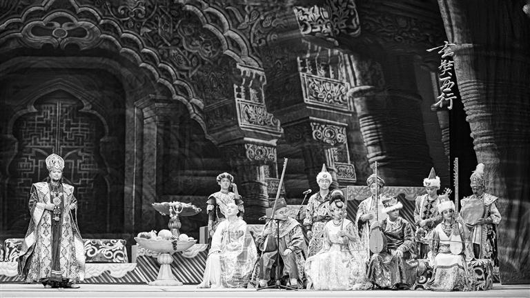 《玄奘西行》靠音樂的轉(zhuǎn)換,把人物內(nèi)心通過音樂表達出來,將人物的心理變化賦予戲劇張力。姜瑩給甘肅省歌舞劇院演出的《玄奘西行》專門配了一版交響樂的伴奏,希望通過交響樂把底子鋪好,通過交響樂和民樂的融合達到氣勢恢宏的效果。