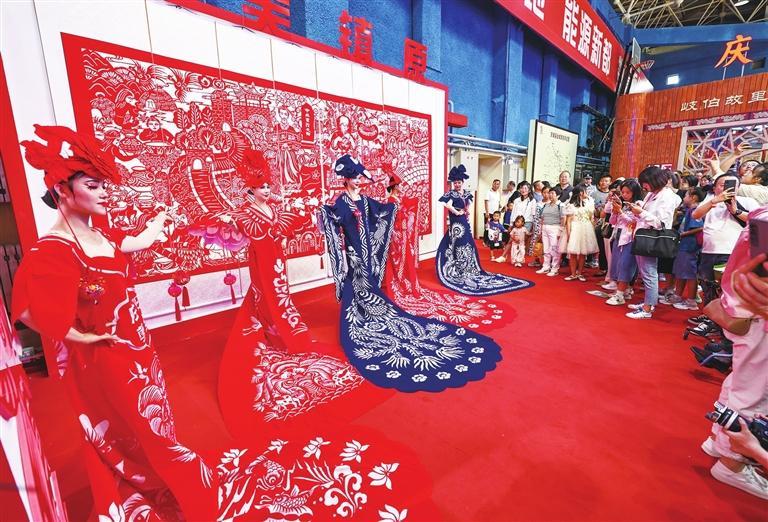 鎮(zhèn)原縣展館推出的剪紙?jiān)胤b吸引大量游客駐足參觀。陳飛