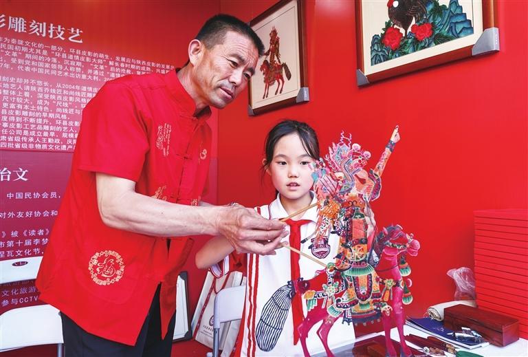 非遺傳承人教學(xué)生表演皮影戲。陳飛