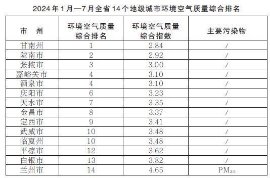 2024年1月—7月,全省14個(gè)地級(jí)城市環(huán)境空氣質(zhì)量綜合排名由高到低分別為:甘南州、隴南市、張掖市、嘉峪關(guān)市、酒泉市、慶陽(yáng)市、天水市、金昌市、定西市、武威市、臨夏州、平?jīng)鍪小足y市、蘭州市。