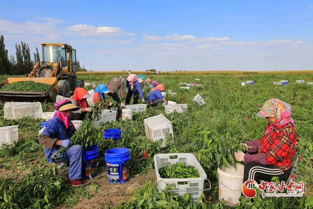 9月1日,嘉峪關(guān)市新城鎮(zhèn)長(zhǎng)城村一農(nóng)民專業(yè)合作社種植的子彈頭辣椒喜獲豐收,種植戶搶抓農(nóng)時(shí)采摘,農(nóng)用機(jī)械車輛穿梭于田間地頭,鄉(xiāng)村田野呈現(xiàn)出一派繁忙的景象。