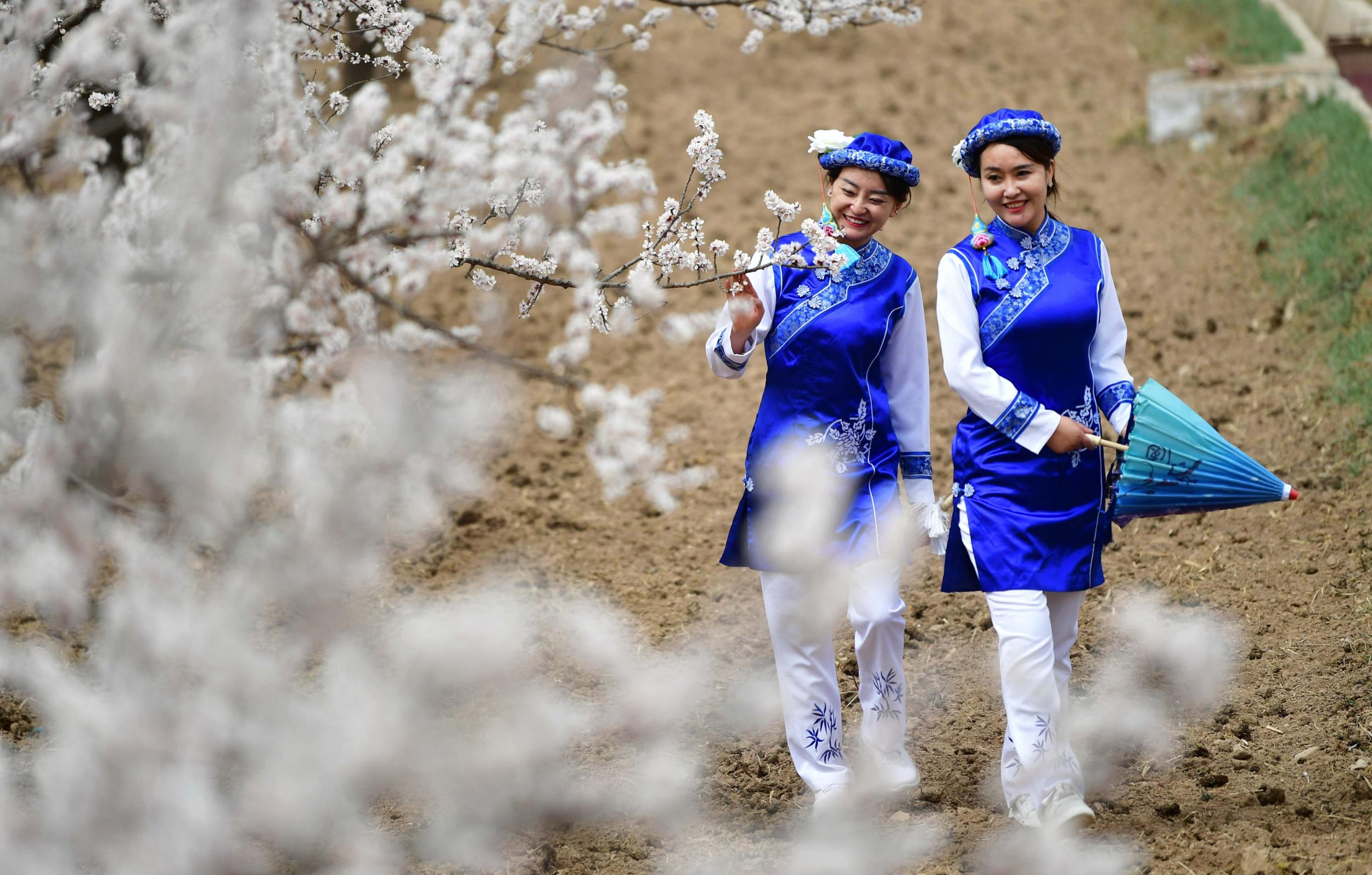 素有“隴上杏花第一村”美譽的甘肅省臨夏回族自治州東鄉(xiāng)族自治縣唐汪鎮(zhèn)杏花競相綻放,吸引了眾多當(dāng)?shù)厝罕姾陀慰吞で噘p花。新華社記者陳斌攝