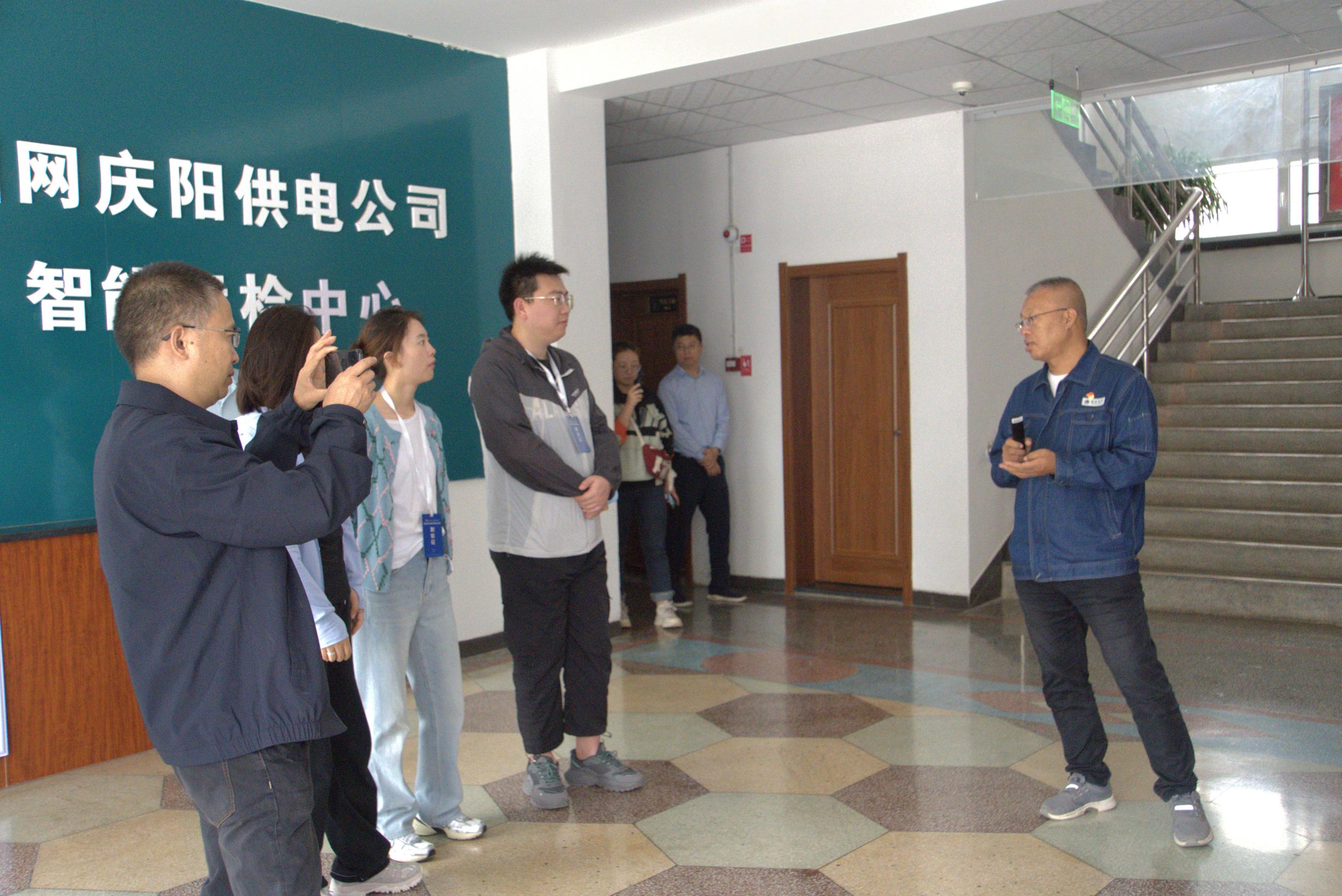 工作人員為采訪團(tuán)介紹國網(wǎng)慶陽供電公司智能運(yùn)檢中心概況