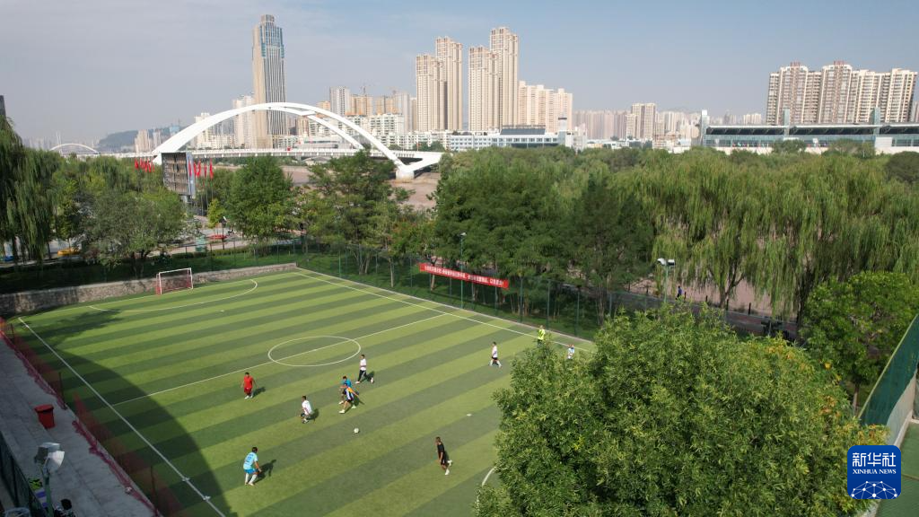 市民在位于黃河蘭州段南岸的體育公園足球場(chǎng)內(nèi)踢球(9月24日攝,無(wú)人機(jī)照片)。新華社記者陳斌攝