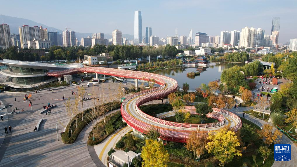 這是位于蘭州市城關(guān)區(qū)黃河北岸的馬拉松公園(10月17日攝,無(wú)人機(jī)照片)。新華社記者陳斌攝