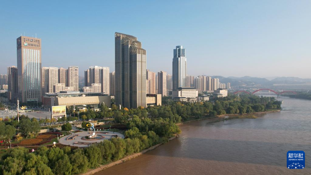 這是蘭州市城關(guān)區(qū)黃河岸邊林立的高樓(9月24日攝,無(wú)人機(jī)照片)。新華社記者陳斌攝