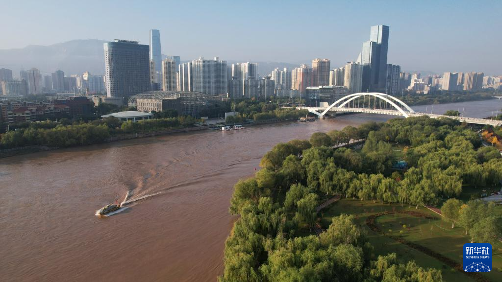 一艘水上巴士從黃河蘭州段航道上駛過(guò)(10月17日攝,無(wú)人機(jī)照片)。新華社記者陳斌攝