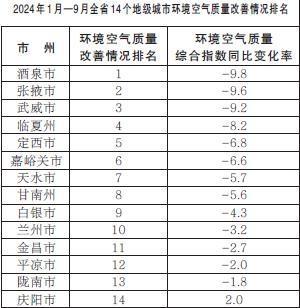 2024年1月—9月,全省14個(gè)地級(jí)城市環(huán)境空氣質(zhì)量改善情況排名由好到差分別為:酒泉市、張掖市、武威市、臨夏州、定西市、嘉峪關(guān)市、天水市、甘南州、白銀市、蘭州市、金昌市、平?jīng)鍪?、隴南市、慶陽(yáng)市。