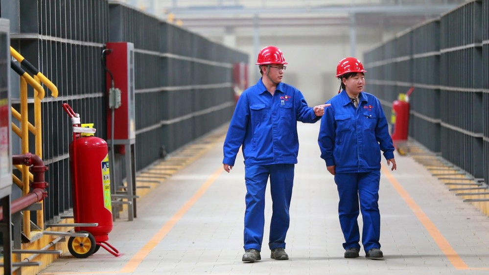 在甘肅稀土公司11000噸萃取生產(chǎn)線,兩名工作人員在巡查這套集數(shù)字化、智能化和綠色化為一體的自動化生產(chǎn)線。(本報記者郭剛 攝)