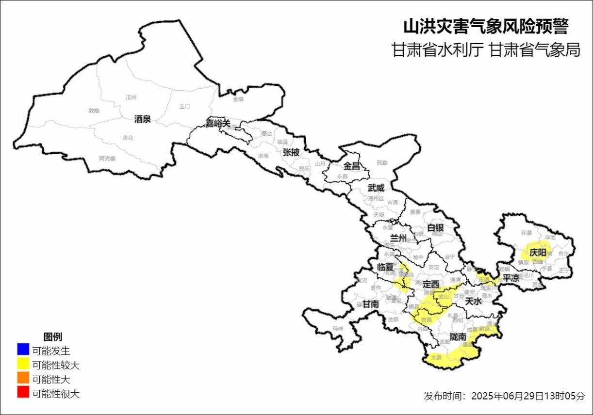 根據(jù)省氣象局《重大氣象信息專報(bào)》(2025年甘氣第10期),未來十天甘肅省多降水天氣,具有對(duì)流性強(qiáng)、小時(shí)雨強(qiáng)大、累積雨量大等特點(diǎn),洪水災(zāi)害風(fēng)險(xiǎn)高。6月29日13時(shí),省水利廳、省氣象局聯(lián)合發(fā)布山洪災(zāi)害氣象風(fēng)險(xiǎn)預(yù)警:預(yù)計(jì),6月29日14時(shí)至30日14時(shí),白銀市(景泰縣),武威市(古浪縣),定西市(臨洮縣、渭源縣、通渭縣、隴西縣、漳縣、岷縣),臨夏州(廣河縣、東鄉(xiāng)縣、康樂縣),甘南州(臨潭縣、卓尼縣、舟曲縣、迭部縣),天水市(秦安縣、甘谷縣、武山縣、張家川縣),隴南市(宕縣、禮縣、武都區(qū)、成縣、文縣、康縣、徽縣、兩當(dāng)縣),平?jīng)鍪校o寧縣、崆峒區(qū)、華亭市、莊浪縣),慶陽市(西峰區(qū)、慶城縣、環(huán)縣、華池縣、鎮(zhèn)原縣)等地區(qū)發(fā)生山洪災(zāi)害可能性較大(黃色預(yù)警)。