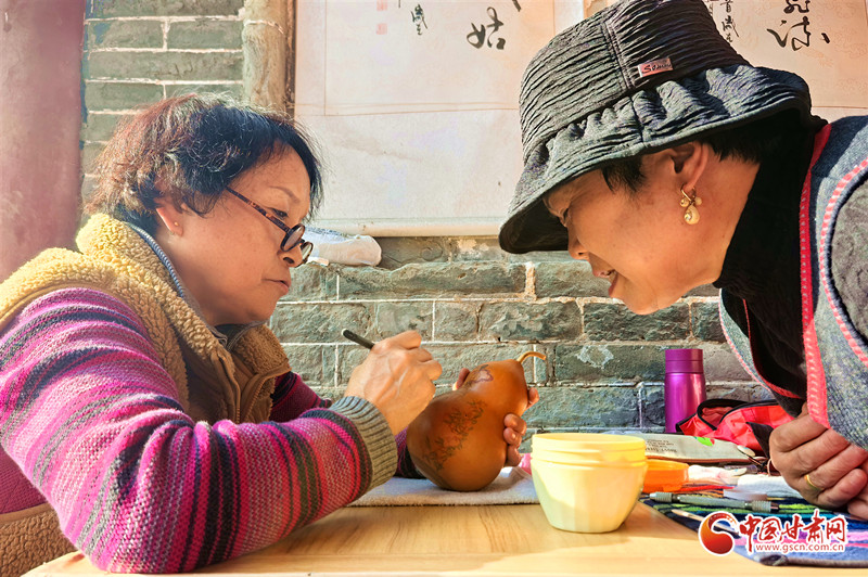 她還走進(jìn)蘭州開(kāi)放大學(xué),為熱愛(ài)刻葫蘆的老年人手把手地傳授技藝,耐心細(xì)致地指導(dǎo)他們?nèi)绾卧谛⌒〉暮J上刻畫(huà)出精美的圖案。