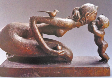 最后的廳,是一批中外馳名的雕塑代表作——從嬌小稚拙掌中把玩的小品到體量龐大高聳入云的巨構(gòu),無論隨形寫意、裝飾寫實(shí),美林都在策劃、構(gòu)成、調(diào)整、定型的繁復(fù)過程中,顯示出扎實(shí)的藝術(shù)功力與非凡的浪漫色彩。其中,龍、虎、馬、牛等動(dòng)物系列,不僅延續(xù)了繪畫中獨(dú)有的造型風(fēng)格,而且更凝重渾厚,更富裝飾情趣。與眾不同人見人愛的母子系列中,不論是精心呵護(hù)襁褓嬰兒的母親,匍匐草地引領(lǐng)學(xué)步的母親,牽手寶寶步入校園的母親,造型、肢體的夸張之奇變形之巧,感官、神態(tài)的風(fēng)韻依依顧盼有情,讓人駐足良久再三流連……