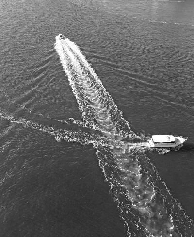 在這張照片里你看見了,天氣晴朗,海水蔚藍(lán),兩船交叉駛過,畫出如此美麗的浪花。這兩艘游船并不是匆匆過客,而是相約作一次表演,海域內(nèi)洋溢著歡樂的氣氛。