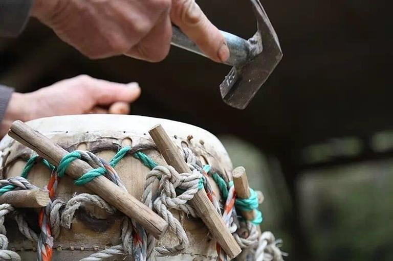 將鼓的兩面牛皮踩緊后,用木釘蘸膠固定在鼓身上,外飾以銅泡釘,裁去多余的牛皮,一面鼓就做成了。