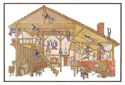 小時(shí)候的安野光雅常常把鏡子擺在地板或榻榻米上往里面看——在那個(gè)世界里,一切都被倒置了,“鏡子里出現(xiàn)了地下室,天花板變成了地板,燈泡直立在地板上。雖然知道那只是映像,但只要我愿意,地下室就能隨時(shí)出現(xiàn)在眼前”。安野光雅說,他迷戀在數(shù)學(xué)和哲學(xué)的領(lǐng)域中構(gòu)筑一個(gè)世界的感覺, “那是一個(gè)立足于現(xiàn)實(shí)的虛擬世界,可以想象,如果虛構(gòu)成真,事情會如何發(fā)展”。