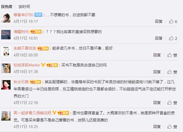 此前,部分網(wǎng)友在中新經(jīng)緯微博評(píng)論對(duì)“圖書(shū)盲盒”現(xiàn)象開(kāi)展討論。有網(wǎng)友提到,“其實(shí)挺理解的,畢竟每年買(mǎi)的書(shū)到了年底總結(jié)的時(shí)候能讀完1/3就不錯(cuò)了,過(guò)幾年再看讀過(guò)一半已經(jīng)是極限,反正精挑細(xì)選的也不是都會(huì)讀的,不如碰碰運(yùn)氣說(shuō)不定還能打開(kāi)新世界的大門(mén)。”也有網(wǎng)友認(rèn)為,“不想看的書(shū),白送我都不要”“買(mǎi)書(shū)不就是挑合適自己的嗎”等等。