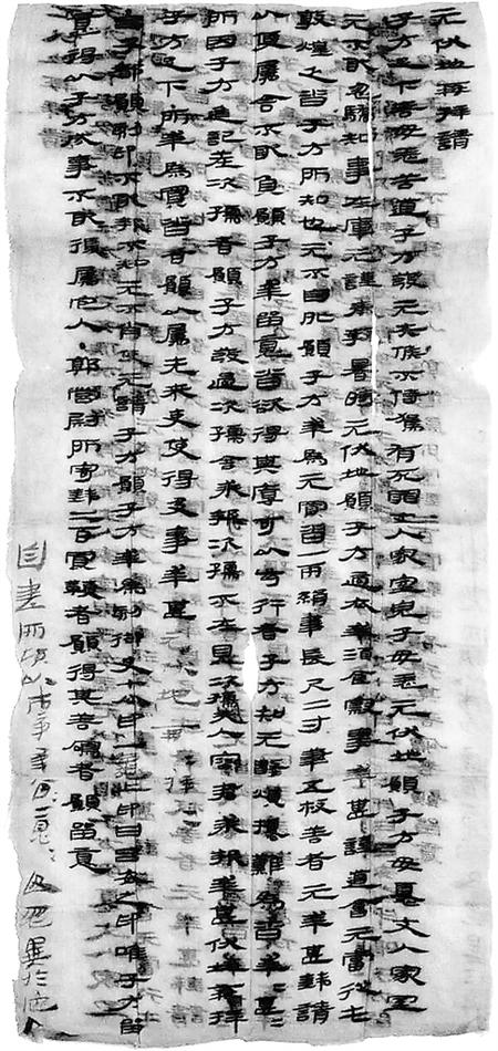 子方足下,善毋恙!苦道子方發(fā),元失候不侍駕,有死罪。丈人、家室、兒子毋恙,元伏地愿子方毋憂。丈人、家室元不敢忽驕,知事在庫,元謹奉教。暑時元伏地愿子方適衣、幸酒食、察事,幸甚!謹?shù)溃簳攺耐投鼗?,乏沓,子方所知也。元不自外,愿子方幸為元買沓一兩,絹韋,長尺二寸;筆五枚,善者,元幸甚。錢請以便屬舍,不敢負。愿子方幸留意,沓欲得其厚、可以步行者。子方知元數(shù)煩擾,難為沓。幸甚幸甚!所因子方進記差次孺者,愿子方發(fā)過次孺舍,求報。次孺不在,見次孺夫人容君求報,幸甚,伏地再拜子方足下!所幸為買沓者,愿以屬先來吏,使得及事,幸甚。元伏地再拜再拜!