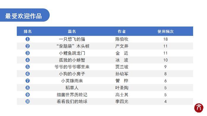 2021年度十大作品榜單為:《一只想飛的貓》(作者陳伯吹)、《“歪腦袋”木頭樁》(作者嚴(yán)文井)、《小鯉魚跳龍門》(作者金近)、《孤獨(dú)的小螃蟹》(作者冰波)、《爺爺?shù)臓敔斈睦飦?lái)》(作者賈蘭坡)、《小狗的小房子》(作者孫幼軍)、《小英雄雨來(lái)》(作者管樺)、《稻草人》(作者葉圣陶)、《細(xì)菌世界歷險(xiǎn)記》(作者高士其)、《看看我們的地球》(作者李四光)。