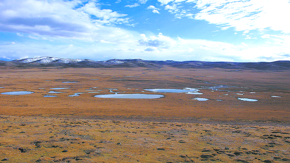 約古宗列位于青藏高原東北部,海拔高度在4200米~4800米,地勢西北高,東南低。站在腳下小泉邊,抬眼先看到的是西面距我們最近的雅合拉達合澤山,它是1952 年新中國第一個河源查勘隊曾認定的黃河源頭山。南望,遠處最高的雪峰,是長江黃河的分水嶺巴顏喀拉山;視線左移,東方藍天白云下,同樣白雪皚皚的是阿尼瑪卿山。以約古列宗為中心輻射,在這東西長約220 公里,南北最大寬150 公里的高山草甸帶與高山草原帶的過渡地帶,東面阿尼瑪卿山阻擋了東南暖濕氣團西進,南面巴顏喀拉山又削弱了溯谷地北進的西南季風勢頭,再加之北面布爾漢布山的屏障作用,把源區(qū)與干旱的荒漠地區(qū)隔開,使這里年平均氣溫在-4℃左右。青藏高原半濕潤地區(qū)氣候和遠處雪山冰川的不斷融化,使母親河上源的兩眼泉和其他那些數(shù)不清的泉,源流不斷,經(jīng)年汩汩。