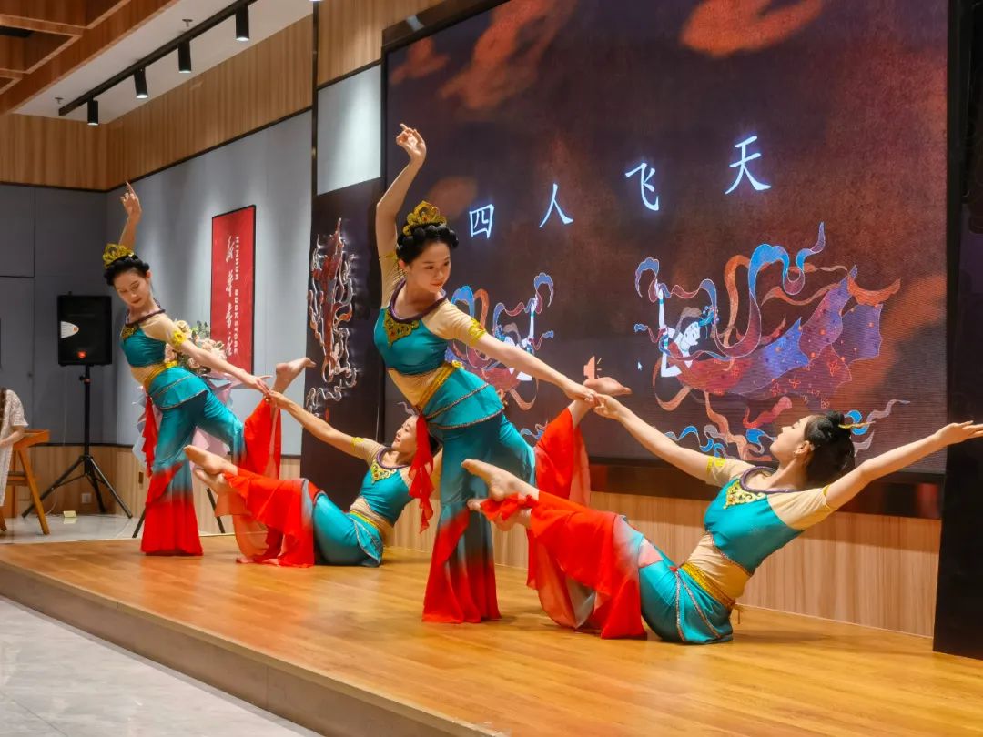 見面會現(xiàn)場,作者介紹了本書創(chuàng)作歷程,并通過“形、神、氣、韻”“抻、曲”“舞姿控制”“四臂觀音”“四人飛天”“胡旋與琵琶”等組合精彩紛呈的表演,使讀者更加直觀地了解本書的主要內(nèi)容和敦煌舞蹈的文化內(nèi)涵,感受敦煌舞蹈傳遞出的藝術價值、文化素養(yǎng)和無窮的魅力。