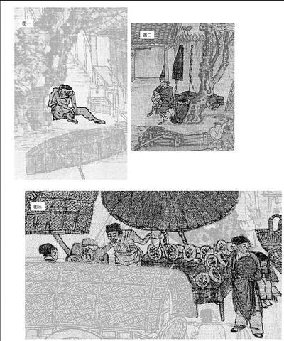 雖然沒(méi)有什么特別的社會(huì)意義、政治意義,或者其他宏大意義,但是對(duì)于個(gè)人來(lái)說(shuō),這個(gè)大叔卻喚醒了我們的某種情感,因此,讓我們與張擇端產(chǎn)生了情感共鳴。是怎樣的情感共鳴呢?請(qǐng)用心看圖,他裸露胳膊,衣著簡(jiǎn)單,是一個(gè)中年勞工形象,此時(shí)也許是午間,他可能只吃了簡(jiǎn)單的飯食(旁邊是飯館,他在飯館外的地上坐著,因此推測(cè)他沒(méi)有進(jìn)店消費(fèi)),甚至有可能他連午飯也沒(méi)舍得吃,只是坐在樹下歇會(huì)兒,然后就要開(kāi)始尋找下午的工作。只要我們用心去看他的樣子,就知道他是真的累了。為了讓讀者更加確信他是因?yàn)檎娴钠@鄱菹?,不知有意還是無(wú)意,張擇端在大叔附近的遞鋪墻外畫了幾個(gè)睡覺(jué)的人,請(qǐng)看圖二。其中,有一個(gè)靠著大樹睡覺(jué)的士卒,他翹著腿,雙臂圍攏,也在睡覺(jué)。