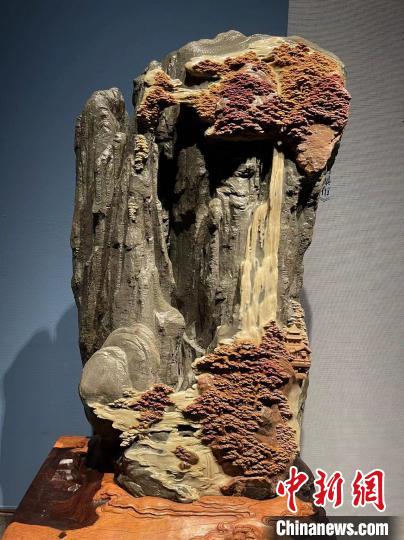 正是因?yàn)閹е@些想法,在創(chuàng)作《飛流直下三千尺》時(shí),徐偉軍并不是在山石頂端直接刻出瀑布,而是讓瀑布從一片松林中垂直而下,“途徑”下一片松林,再流向四周,創(chuàng)造出瀑布的磅礴之勢(shì)。記者看到,整件作品,氣韻生動(dòng)。徐偉軍還特地保留了原石粗糙的表皮,刻畫出懸崖峭壁的嶙峋之態(tài)。