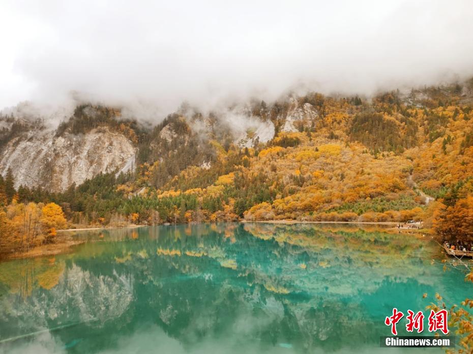 資料圖:深秋時節(jié)的九寨溝景區(qū)滿山的彩林與碧藍(lán)的海子交相輝映,宛如一個色彩繽紛的童話世界。曹惠君 攝