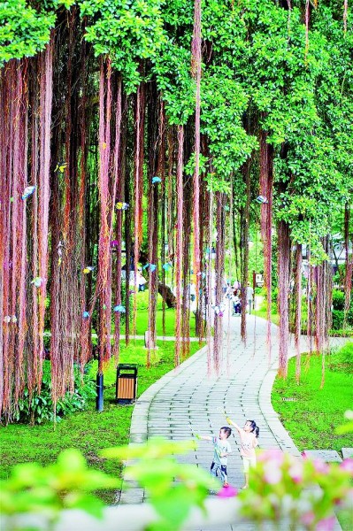 兩名兒童在福州市江心公園里的榕樹(shù)下玩耍。新華社發(fā)