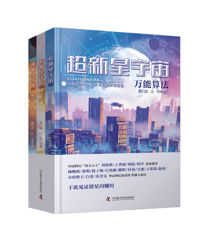 《超新星宇宙》由著名科普科幻作家董仁威、著名科幻學(xué)者三豐主編,第一輯分為《萬(wàn)能算法》《鑄夢(mèng)》《風(fēng)雪夜歸人》共三冊(cè),收錄了榮獲第十、十一、十二屆華語(yǔ)科幻星云獎(jiǎng)2016-2020年度新星獎(jiǎng)獲得者楊晚晴、慕明、段子期、石黑曜、滕野、付強(qiáng)、吳楚、王諾諾、趙壘、分形橙子、白賁、蘇莞雯等12名新銳作者的18篇作品。