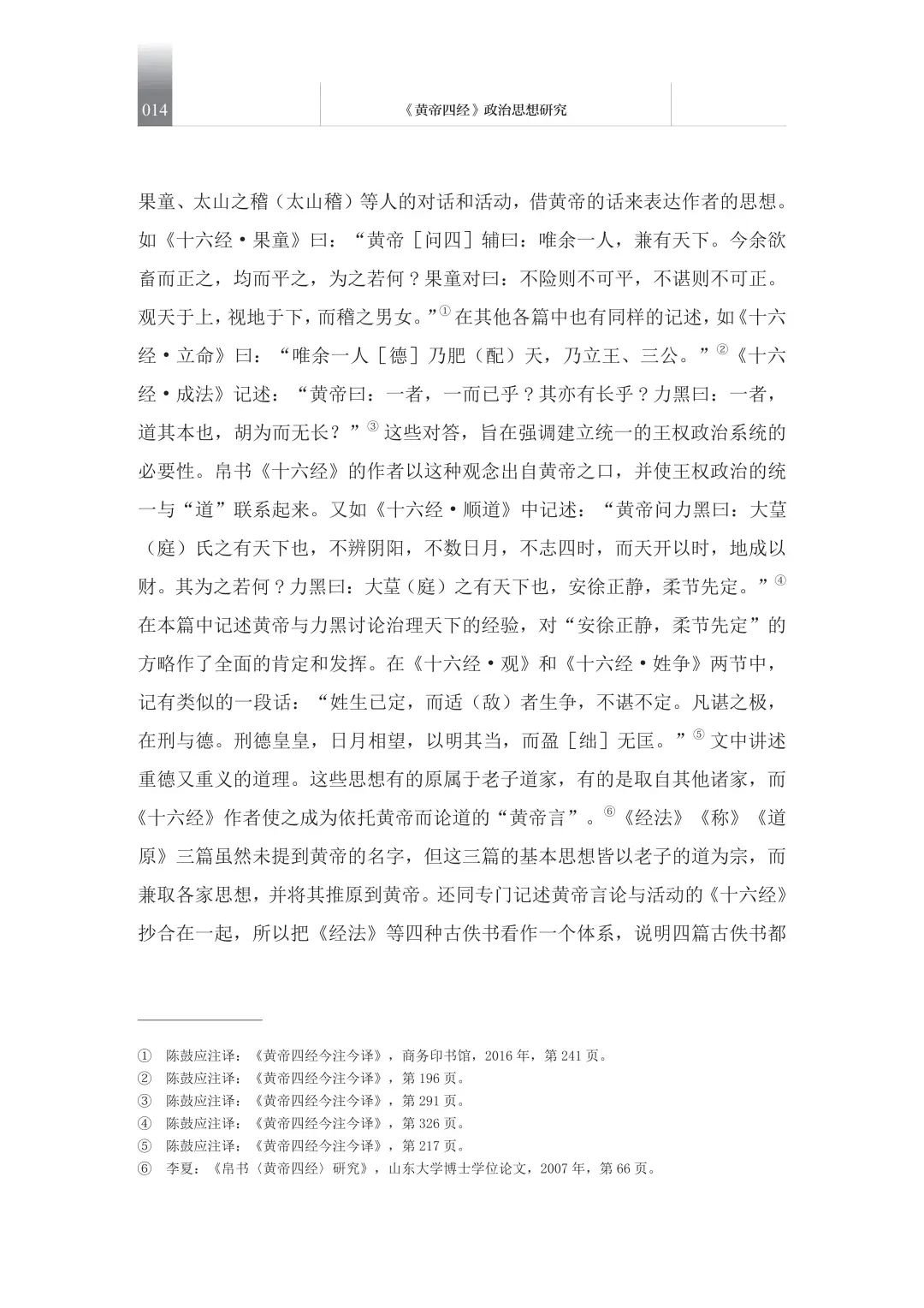 《黃帝四經(jīng)》作為東周之前各朝修身治國的指導(dǎo)性經(jīng)典,其修身治世功用迄今依然具有極高的現(xiàn)實(shí)意義和指導(dǎo)價(jià)值。本書以《黃帝四經(jīng)》為研究起點(diǎn),重點(diǎn)探索黃老政治思想中的重要概念,并試圖從核心詞匯“道”“德”概念的演變及其相互作用來探究黃老學(xué)說的起源發(fā)展的學(xué)術(shù)邏輯,尤其從“德”含義的拓展與遷移去分析黃老哲學(xué)政治德性的建立,隨之引出黃老政治思想中的重要概念“道法”“刑名”“刑德”“因循”等,并希望由此描摹出黃老政治思想的特性。