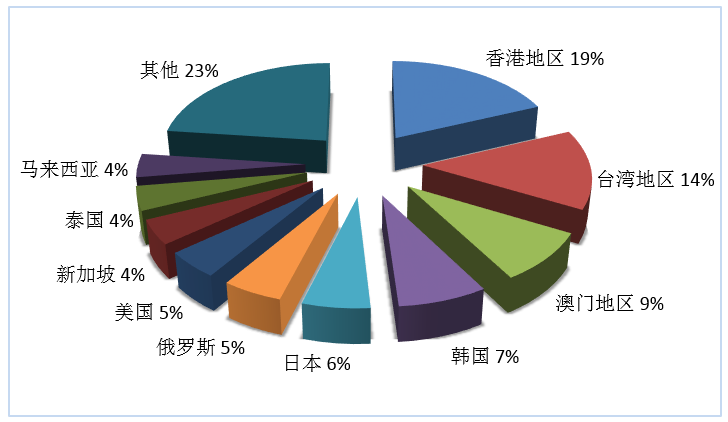 第三季度旅行社入境旅游接待人次排名前十位的客源地國(guó)家或地區(qū)由高到低依次為香港地區(qū)、臺(tái)灣地區(qū)、韓國(guó)、澳門地區(qū)、美國(guó)、俄羅斯、馬來(lái)西亞、日本、新加坡、泰國(guó)(見圖2)。