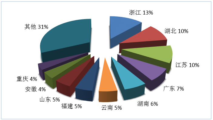 第三季度旅行社國(guó)內(nèi)旅游接待人次排名前十位的地區(qū)由高到低依次為浙江、湖北、江蘇、廣東、湖南、云南、福建、山東、安徽、重慶(見圖4)。