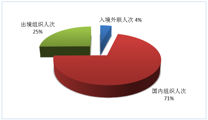 按照入境外聯(lián)人次、國(guó)內(nèi)組織人次、出境組織人次三項(xiàng)指標(biāo),入境旅游、國(guó)內(nèi)旅游、出境旅游市場(chǎng)人次所占份額依次為4%、71%和25%(見圖6)。