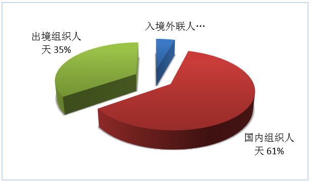按照入境外聯(lián)人天、國(guó)內(nèi)組織人天、出境組織人天三項(xiàng)指標(biāo),入境旅游、國(guó)內(nèi)旅游、出境旅游市場(chǎng)人天所占份額依次為4%、61%、35%(見圖7)。