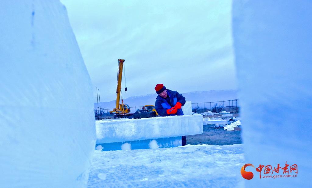1月11日傍晚,張掖市甘州區(qū)屋蘭古鎮(zhèn)九曲黃河燈陣景區(qū)冰雕工藝師們正在加班加點趕制大型冰雕。