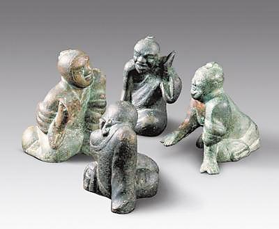 20世紀90年代甘肅靈臺縣出土了一組西漢銅質(zhì)博戲俑。俑最高9.2厘米,最寬9.7厘米。四俑相向跪坐,身著高領(lǐng)長服。其中二人頭挽發(fā)髻,二人以寬巾裹頭。坐姿不同,形態(tài)各異,有的前傾仰首,有的垂臂塌肩;有的袒胸露膊,似在伸手探取;有的屈腿斜身,默然扶膝靜坐。四俑的面部表情不同,刻畫細膩。他們或喜笑顏開,或嚴肅面對,或凝神沉思,或略顯悲愁,神態(tài)活現(xiàn),精彩逼真,具有高超的藝術(shù)性和研究價值。