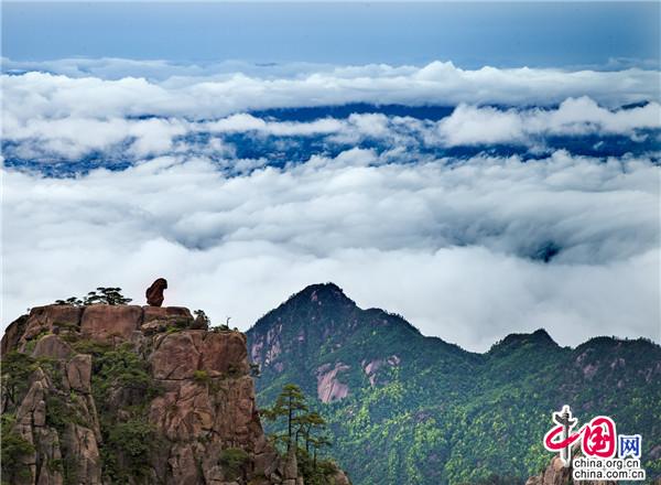 云海是黃山美景的精髓與靈魂所在,如上帝的神來(lái)之筆,賦予了黃山深邃含蓄的意境。黃山植被覆蓋率高,溫潤(rùn)的水汽常年縈繞,跟著風(fēng)游走,或聚或散,或濃或淡。云衫映幽山,薄霧罩峰巒,疑似仙境銀河墜落人間。