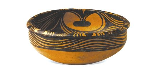 馬家窯文化馬家窯類(lèi)型(距今約4800年),1966年蘭州市王保保城出土。這是一只工藝精湛,保存完好的彩陶盆,這只旋紋彩陶盆最大的特點(diǎn)是盆內(nèi)壁上繪的三組變體人面紋,同學(xué)們看出這組圖像人面嗎?看懂人面紋需要發(fā)揮想象力,總之,我們的先祖抽象表達(dá)的能力及想象力真令今人景仰!